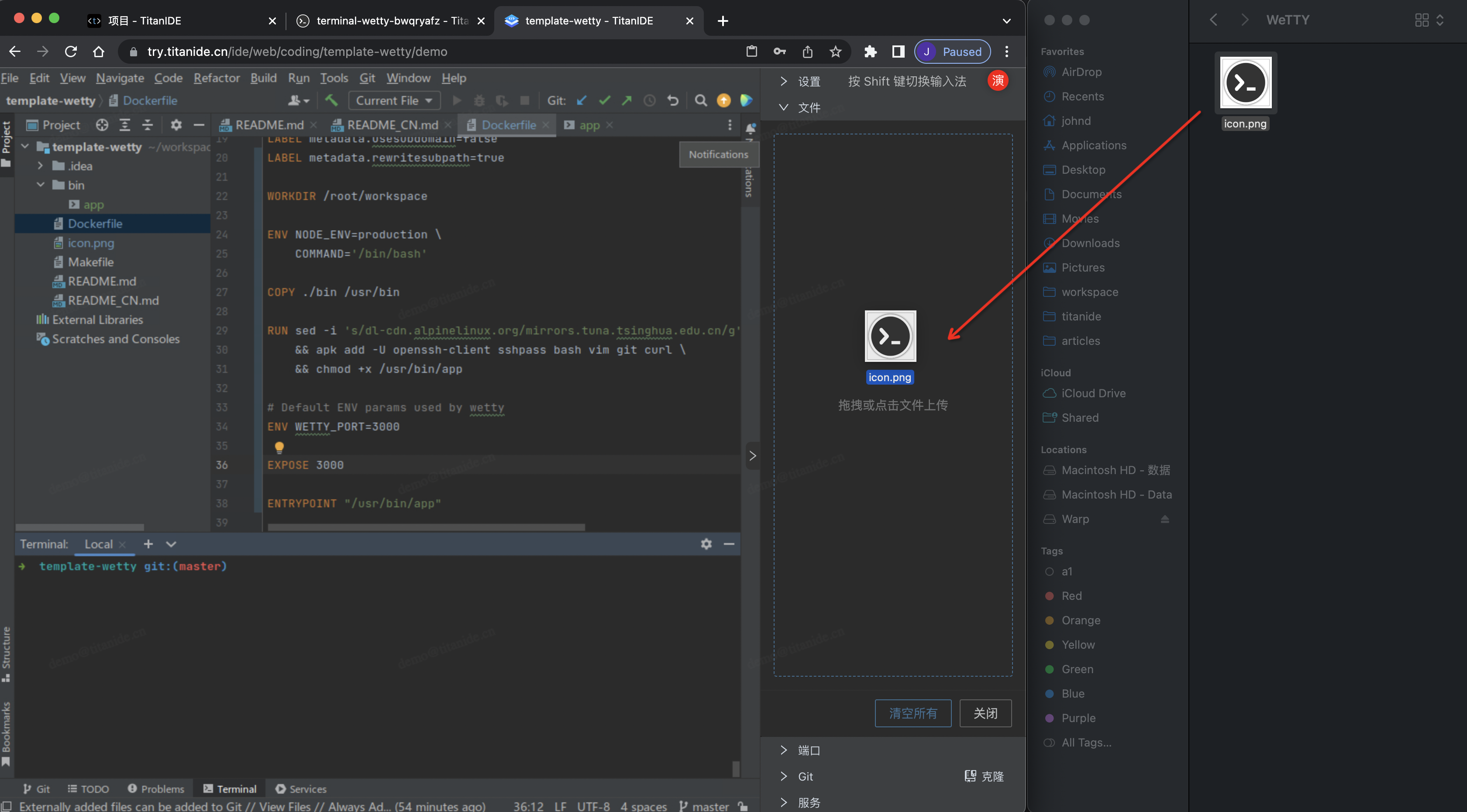 要在 TitanIDE 运行一个全新的 WeTTY, 首先需要构建一个模板镜像,然后通过模板镜像创建模板,再通过模板创建项目。当然以上是一次性操作,以后就可以直接通过创建好的模板创建项目即可。