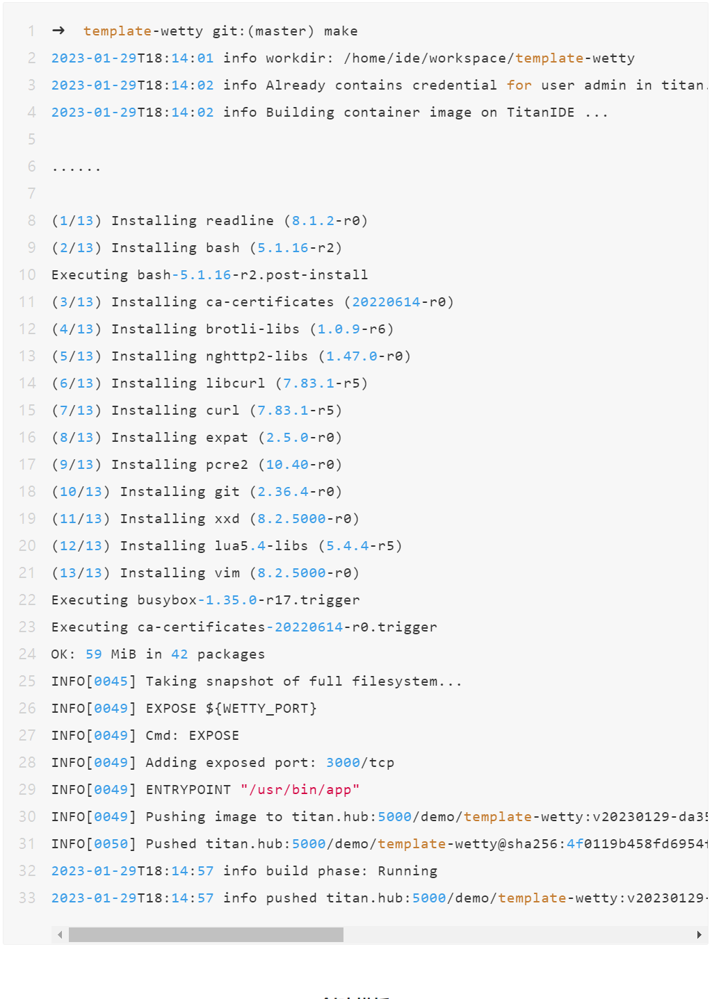 TitanIDE 内置了镜像构建工具,具体的命令行在 Makefile 里面,执行 make help查看帮助。