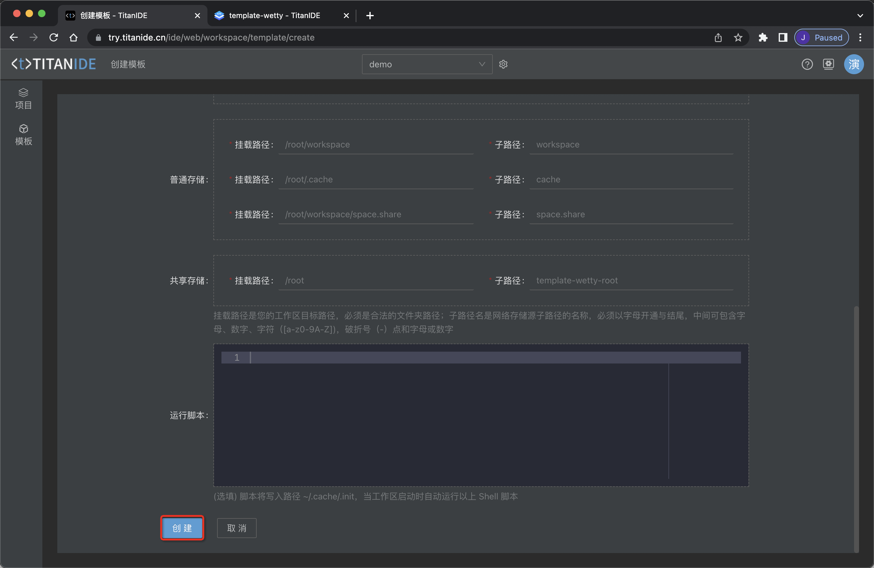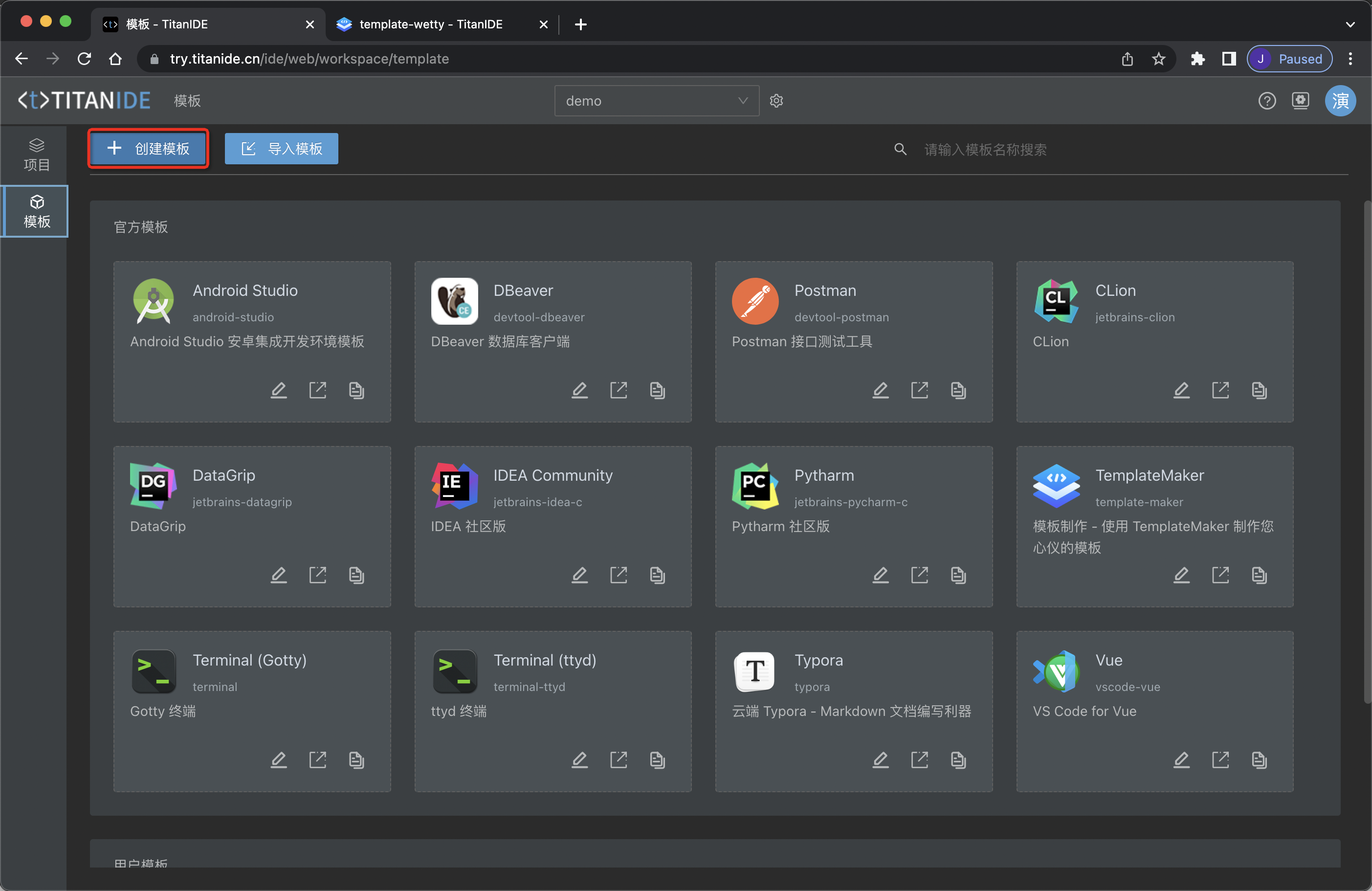 通过简单的两步,再点击「创建」即可创建好 TitanIDE 的模板。
