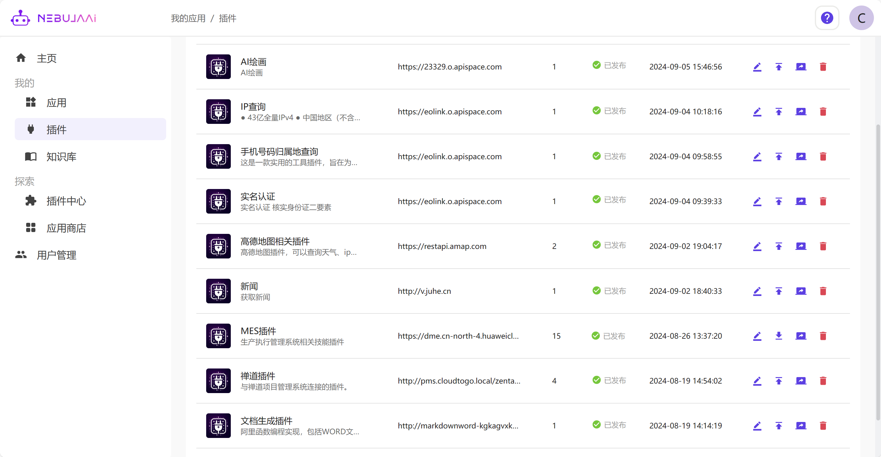 目前 NebulaAI 支持自定义添加多款插件,延伸拓展大模型技能,赋予智能应用专属的超能力。
