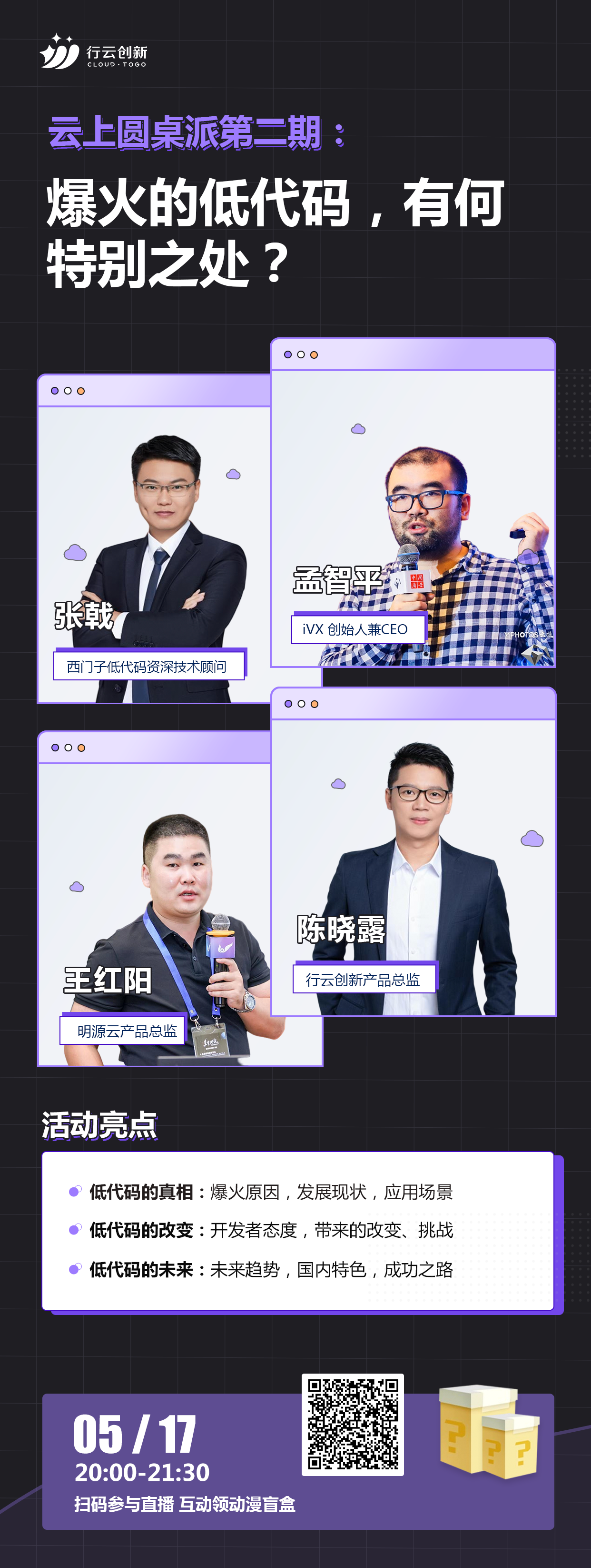 5月17日20:00《云上圆桌派第二期:爆火的低代码,有何特别之处》直播来啦!活动邀请西门子工业软件西门子低代码资深技术顾问张戟,iVX 创始人兼CEO孟智平,明源云产品总监王红阳,leyu.乐鱼创新产品总监陈晓露四位大咖和leyu.乐鱼创新CEO马洪喜一起对低代码爆火背后的原因、开发者对低代码的态度、低代码带来的变化和应用场景等多个话题展开讨论。